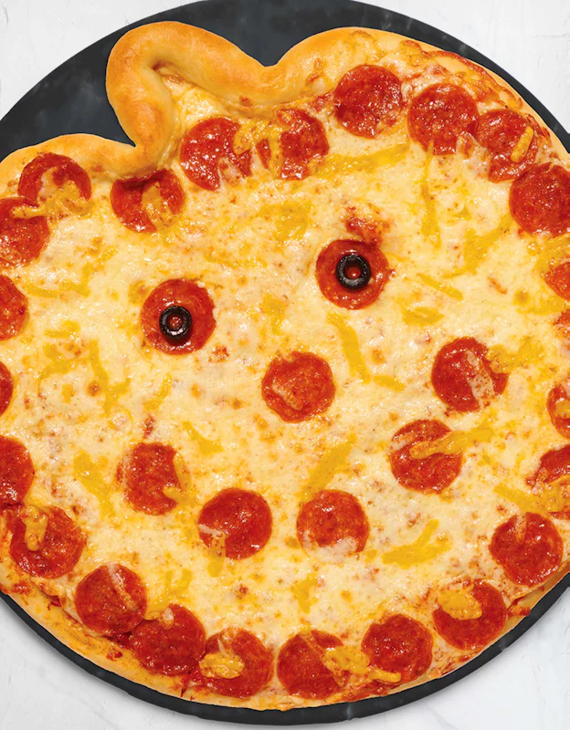 Original Crust in the shape of a Jack-O-Lantern, topped with Red Sauce, Whole-Milk Mozzarella, Cheddar, and a Pepperoni face
